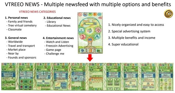 Project VTREEO - "Together We Can Grow" also have it's own social media platform called "VTREEO News", which uses a multiple and multi beneficial newsfeed to keep all personal news, general news, advertisements and all other services and entertainment nicely organized and easy to access.