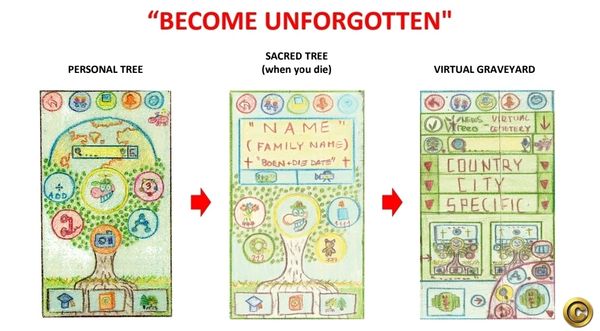 Everything that you saved into your "Virtual Tree of Life and Knowledge" will also play a massive role in our "VTREEO Virtual Tree Graveyard" where even kids of your kids will be able to visit you, watch a movie about you, read a book about you or even light a virtual candle for you.